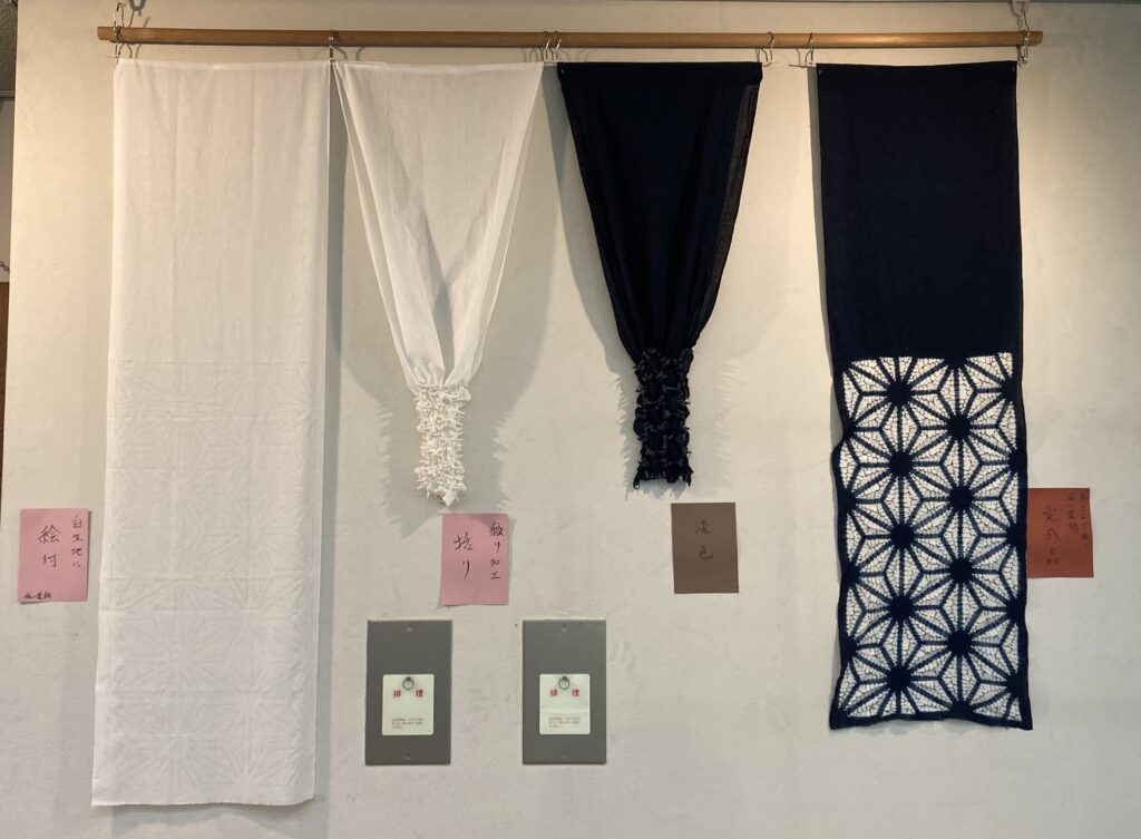 真っ白な生地から絞り染めの完成までが分かりやすく展示されています。
