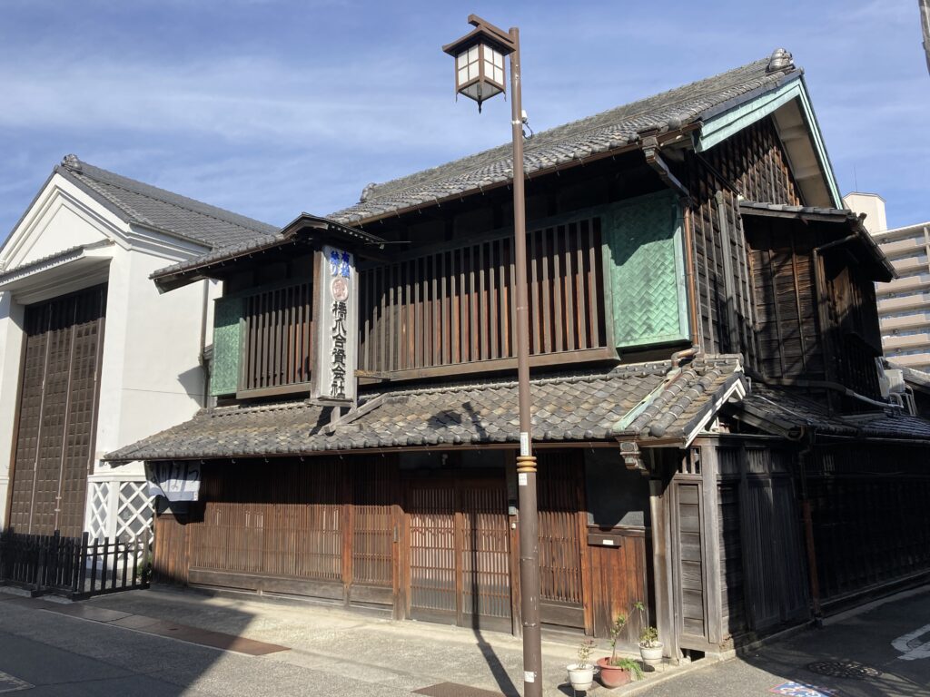 建物は明治大正らしく、2階部分が高くなり木の格子が取り付けられている。普通の民家にしか見えないのに、会社の看板がかかっているのが不思議な感じがします。
