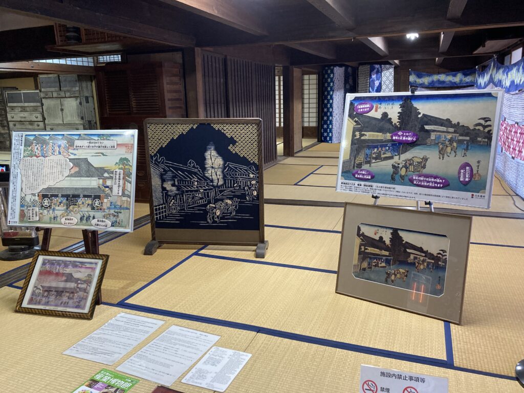 当時の有松を描いた浮世絵が展示されています。左側の絵は尾張藩士、小田切春江が描いた丸屋丈助店先。〇に丈の店頭幕が今と一緒ですね。