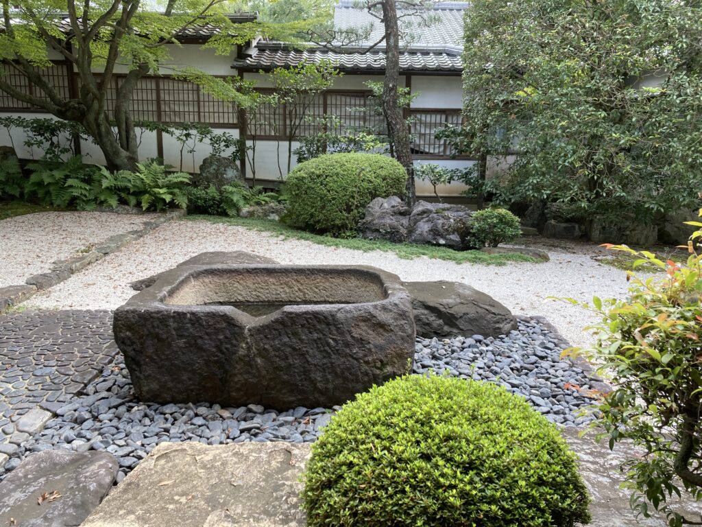 白砂と石畳の境目はきれいな直線になっています。小堀遠州は日本庭園にはじめて直線を取り入れた作庭家と言われており、小堀遠州流の特徴の一つとなっています。当時としてはかなり斬新だったそう。