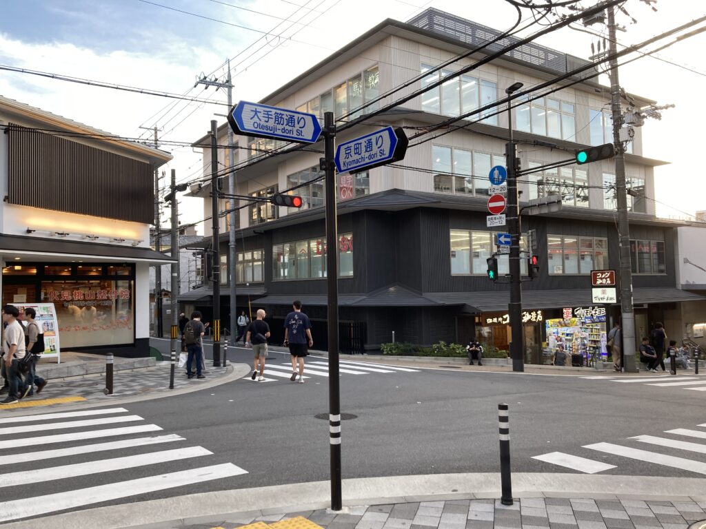 少し西へ行くと、京町通りとの交差点があります。ここで一瞬坂がなくなり、その先で再び坂が復活しています。