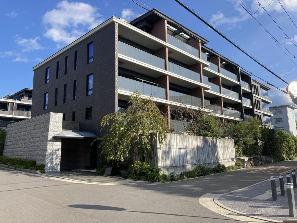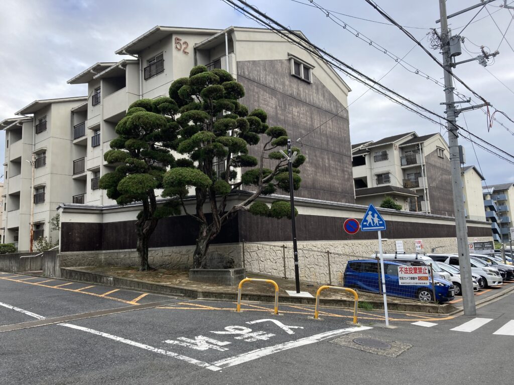 御香宮神社から桃山御陵前駅手前の細い道を曲がり南へ行くと、桃陵団地があります。団地の周りは石垣風の土台に瓦が乗った木造の塀が囲っています。団地の壁面も木造風で、入口には松の木があり団地らしくない雰囲気。