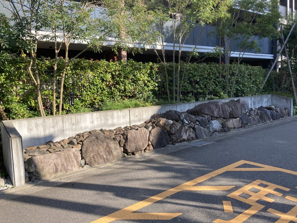 このマンションに石垣が残っているとのことです。マンションを建てる際の発掘調査で見つかった石垣を、展示しているらしいです。