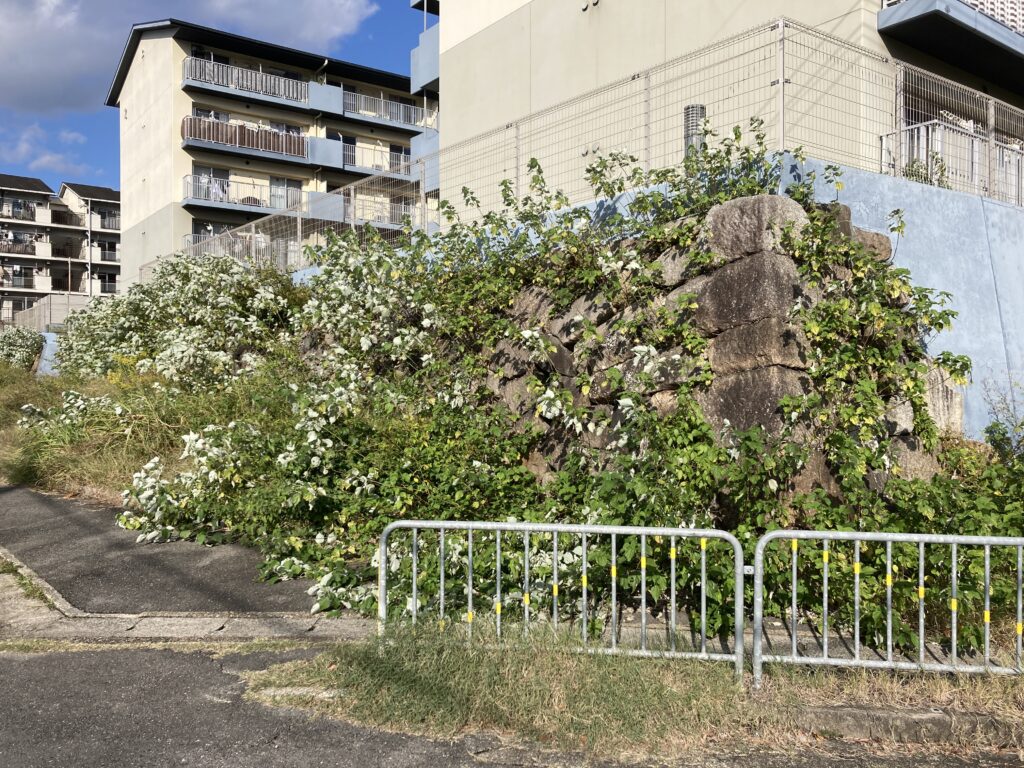 団地を南の方に行くと少しだけですが、当時の石垣が残っている箇所がありました。草でボーボーになっていて放置された山城みたいですが、それがかえって時の経過を感じさせてくれます。