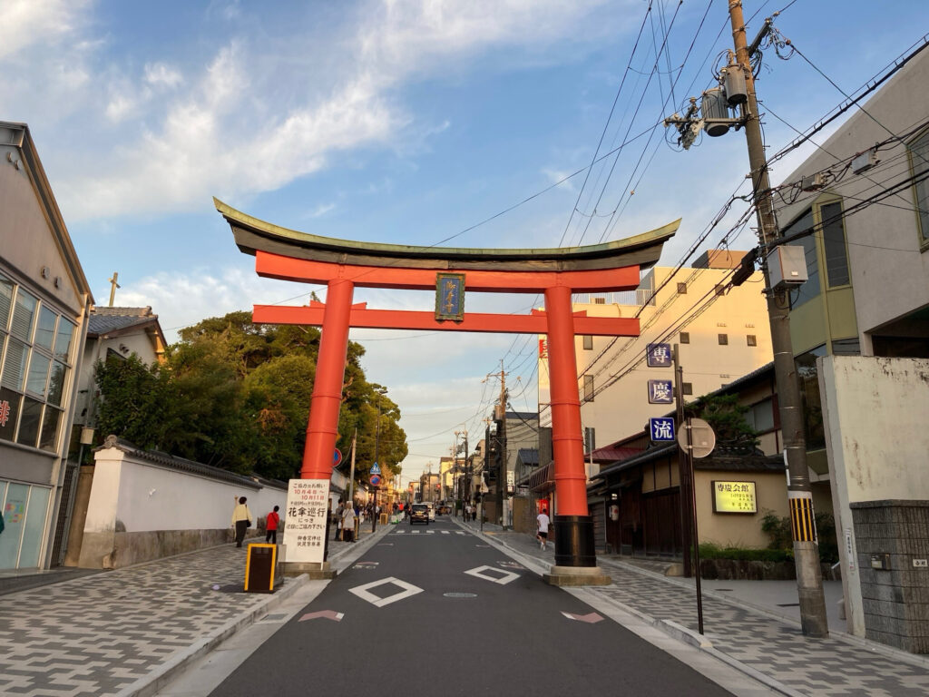 御香宮神社正面の道が大手筋です。商店街は神社から西へ進んだところにあります。その途中にも大きな鳥居がありました。