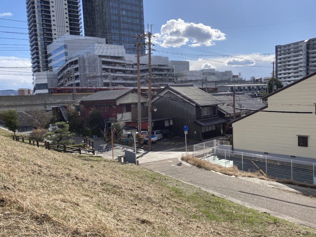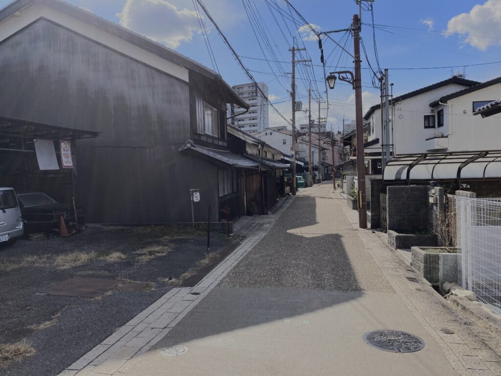 すぐ近くには京阪特急が走っています。旧街道と鉄道が並行する風景は、数百年かかった技術発展の歴史を同画面上に映し出し、過去は遠いものではなく今もすぐそばで生き続けていることを伝えています。