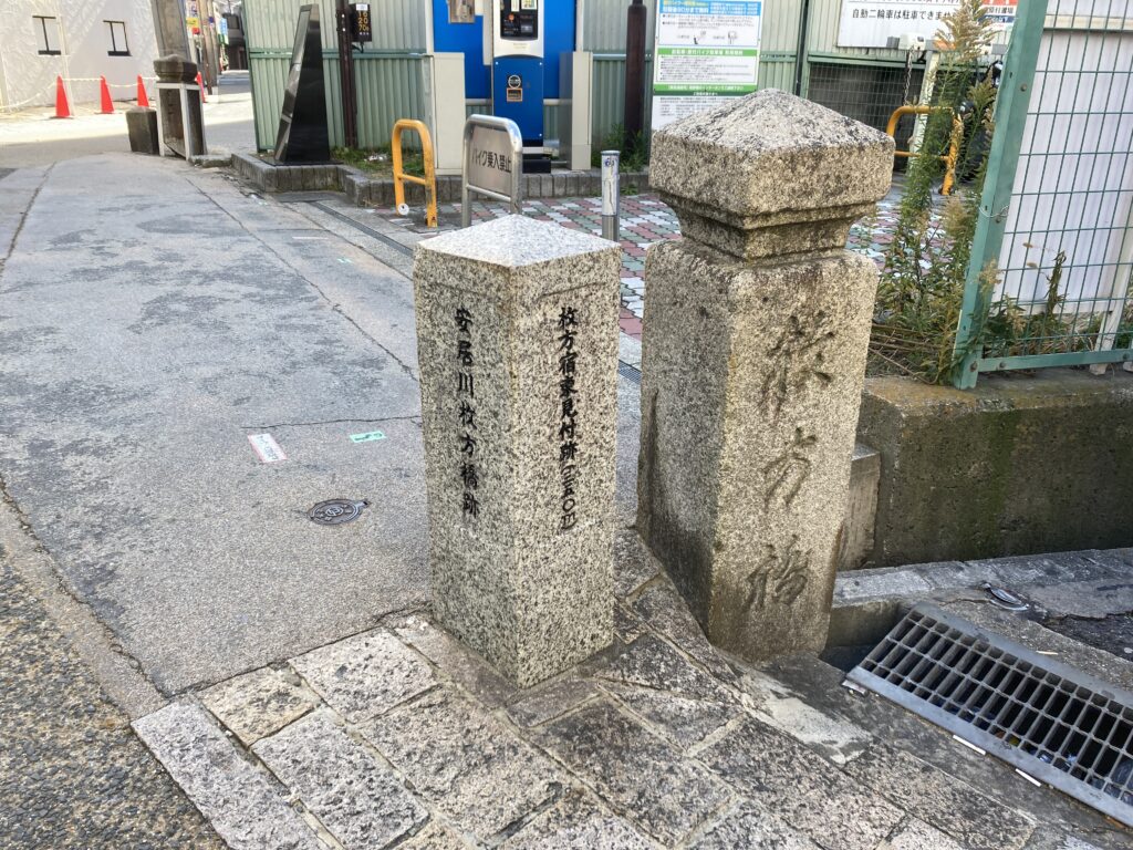 それは枚方橋と書かれた石碑にありました。古いほうは、かつてあった安居川にかかる枚方橋の欄干の一部です。