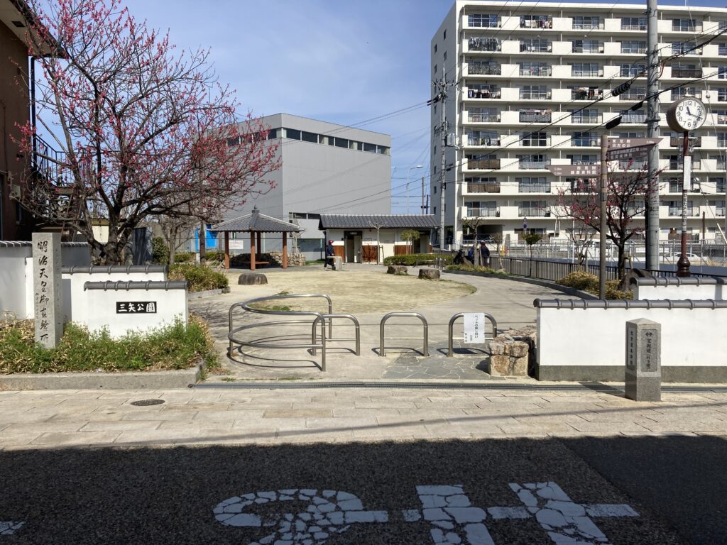 塩熊商店の向かいは公園になっていて、枚方宿の本陣はここにありました。塀や東屋、お手洗いなどが白漆喰や瓦屋根になっていて、当時の雰囲気を醸し出しています。