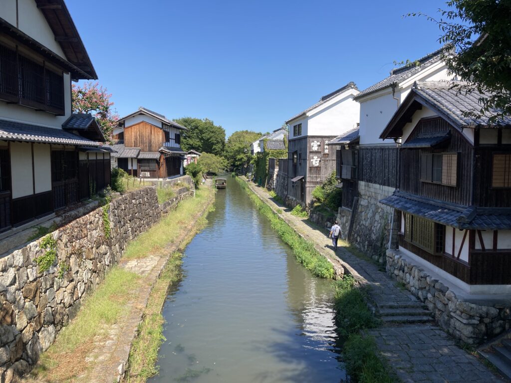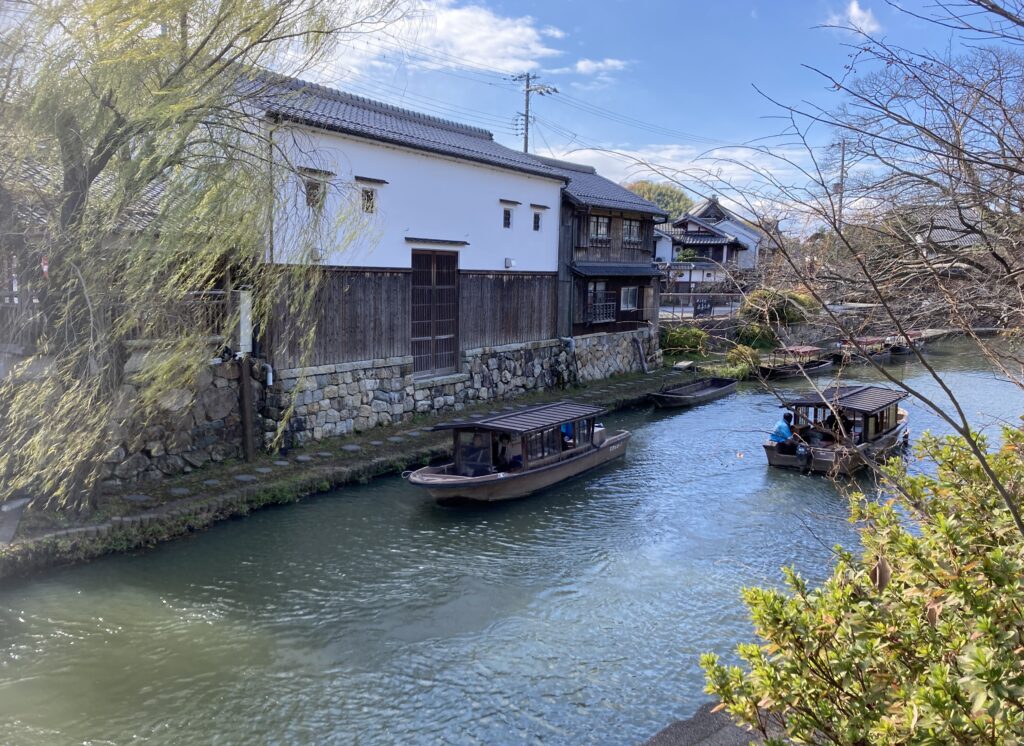 水堀に石垣、白漆喰の蔵、堀を進む川船、時代劇ロケにこれほどピッタリな風景はそうないだろう。