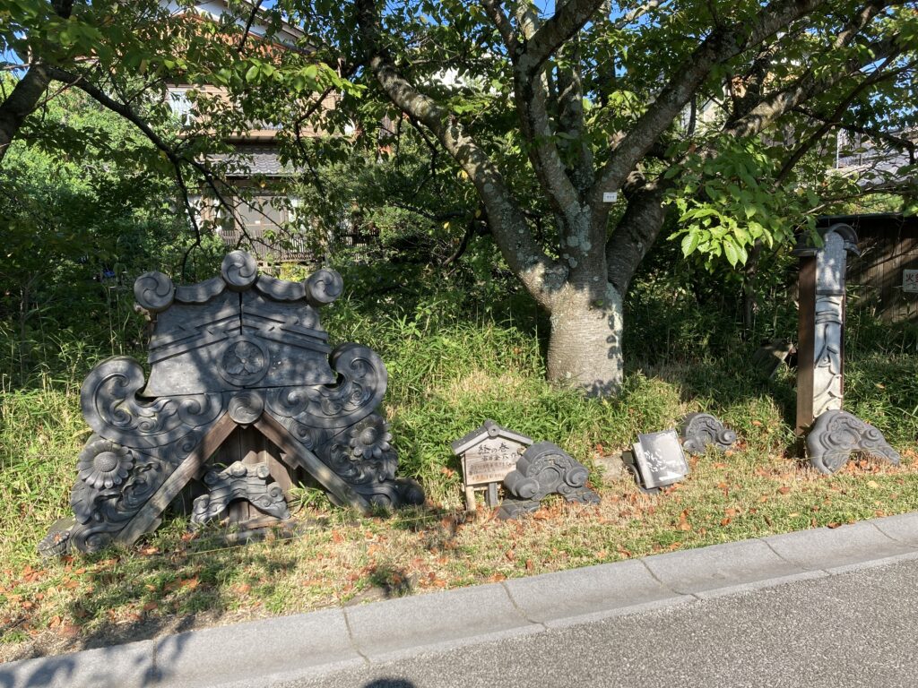 鬼瓦が並べられている。鬼瓦とは瓦屋根の端っこに設置されている瓦で、鬼の顔や家紋を型取った装飾がされている。オードリー春日ではない(笑)。