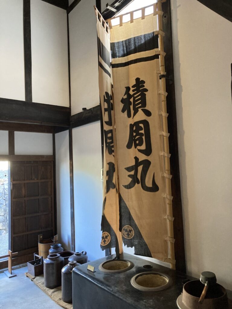 天井が高くなっている土間には、船の名と瀧田家の家紋を冠した旗が飾られていました。