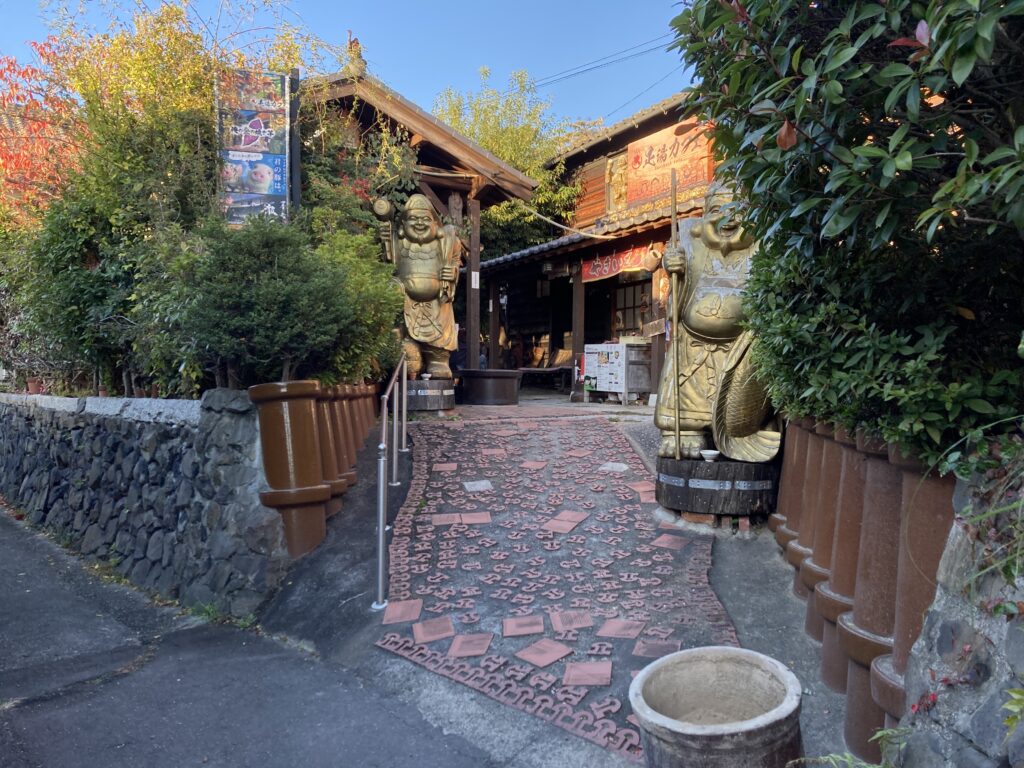 前述の隠れ家的カフェと打って変わって、アピール強めの足湯カフェ。金色の大黒天と恵比寿様の像が派手派手しく出迎えている。