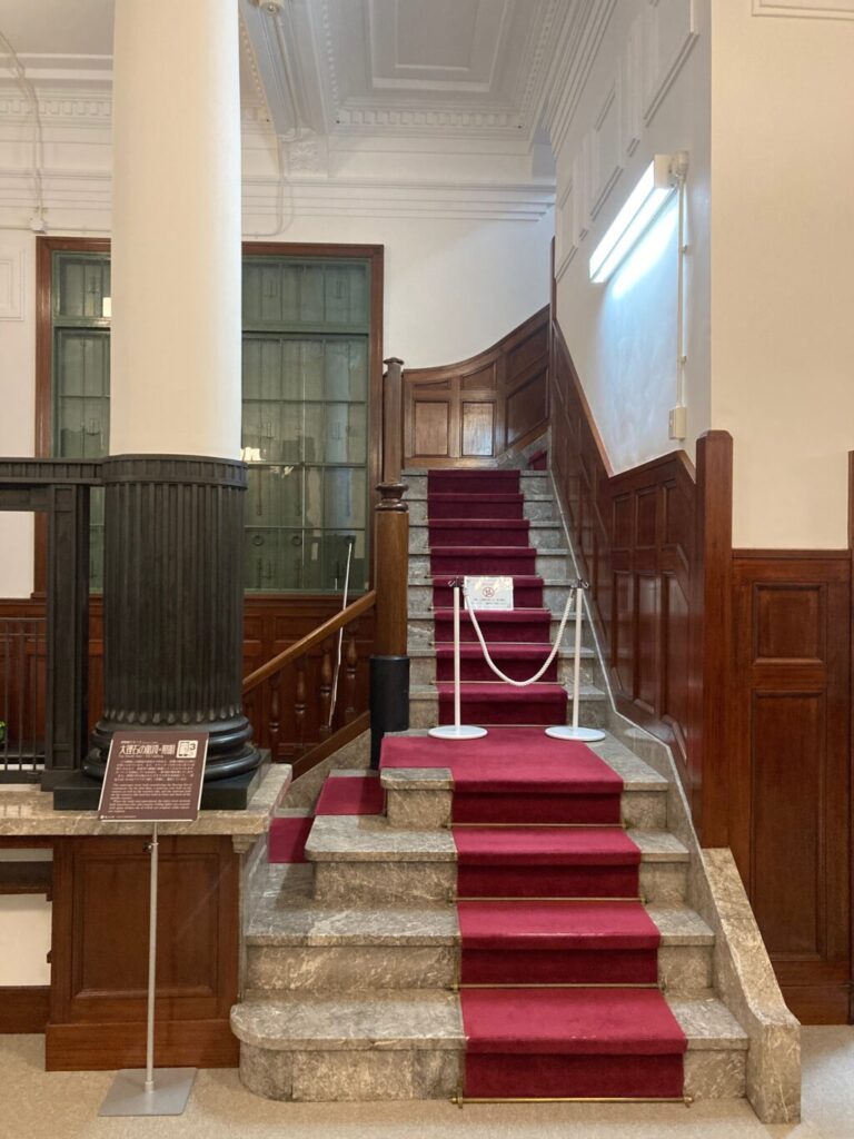 大理石に赤カーペットが敷かれた階段って…。ここは宮殿ですか。いくら安心感を与えるからといって、ここまで豪華にする必要ってあるか?