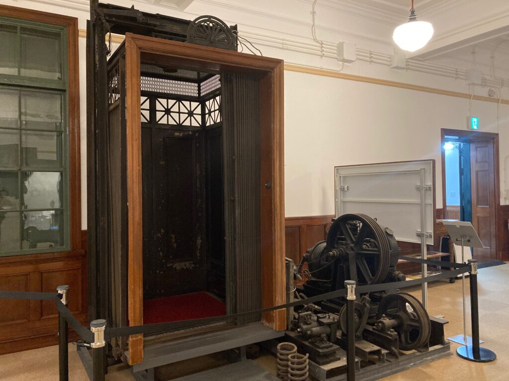 1925(大正14)年に製造された、北陸初のエレベーターでした。扉は手動で開け閉めする蛇腹式で、運転手が同乗して操作をします。当時の敦賀が最先端を行く港町であったことを感じさせてくれます。