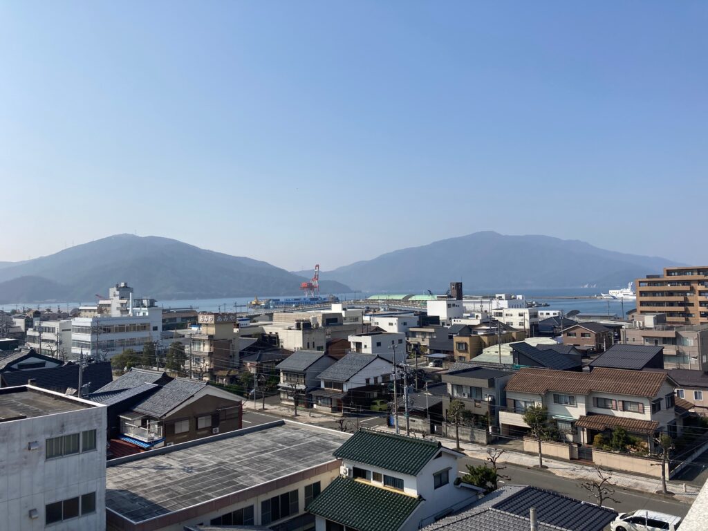 4階の屋上まで登ってきました。当時は敦賀でもトップクラスの高層ビルでしたが、今では右の方にあるマンション?のほうが高く海の景色を遮っています。