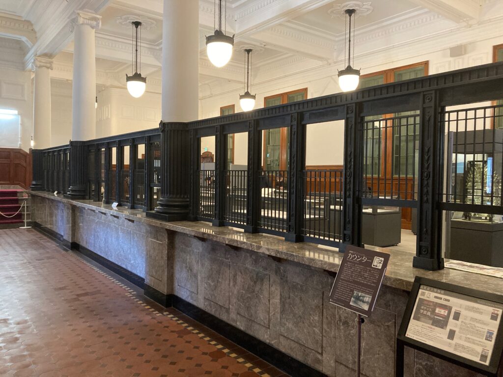 館内に足を踏み入れると、いきなり高級感漂う空間が。カウンターは大理石で出来ているそうです。今の殺風景な銀行からは考えられない豪華さ。