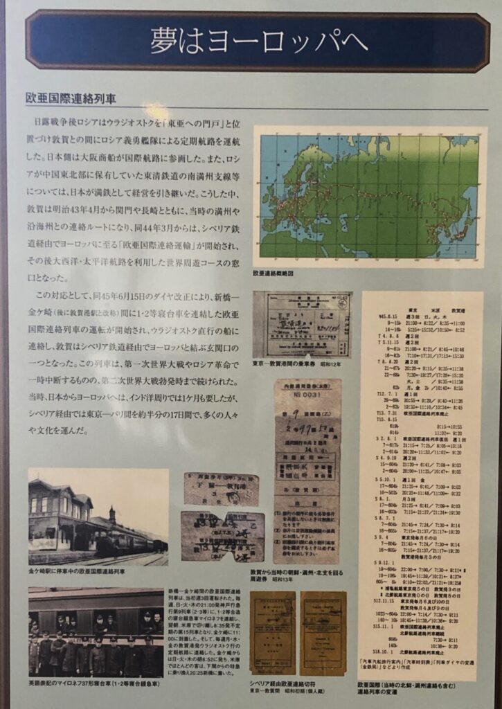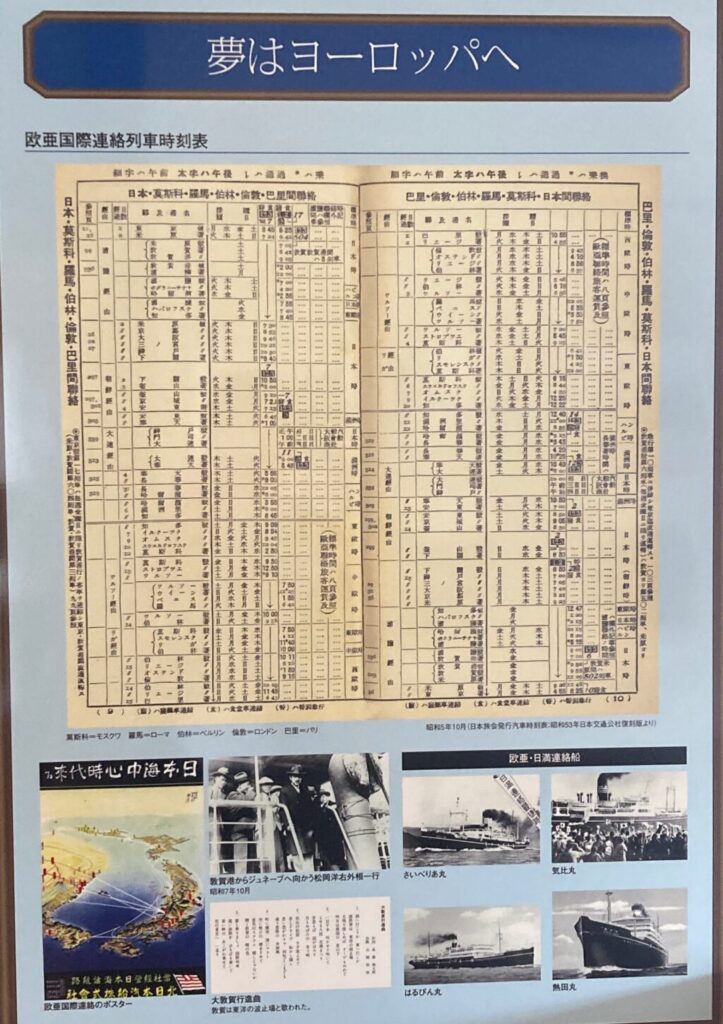 欧亜国際連絡列車の時刻表が展示されています。細かいところまでは読み取れませんが、大陸に渡るルートは敦賀ーウラジオストクの他に下関ー釜山ルートがあったみたいですね。